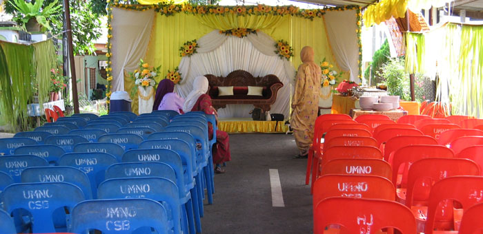 the front of a lecture hall. Pelamin (wedding dais) is specially for "bersanding" ceremony -- the highlight event besides the akad nikah (marriage contract).