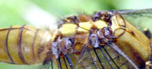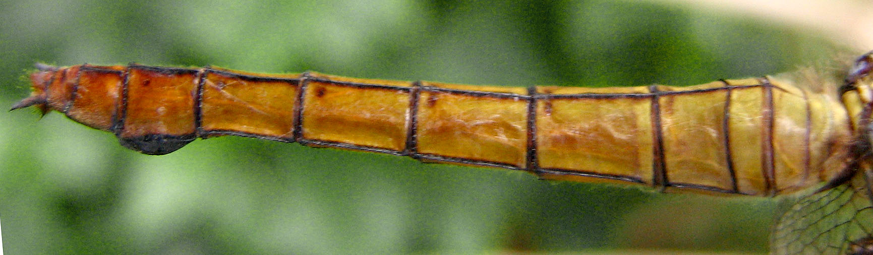 confused. Orthetrum chrysis , is smaller than Orthetrum testaceum , the thorax is dark tending to black, and underneath the base of the abdomen, in front of the secondary genitalia, is a strong tuft of black hairs looking like a small curved spine to the naked eye. In Orthetrum testaceum the thorax is a light orange-brown with NO tuft of hairs at the base of the abdomen. |