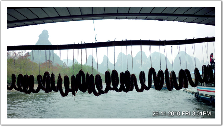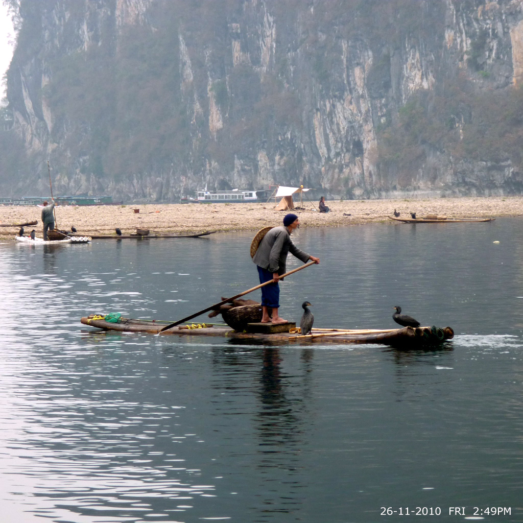 Evening, fishermen begin to gather along Li River on their gas-light bamboo rafts with cormorant-birds. These cormorant birds are trained to dive into the clear river where fished are. After catching a fish on its mouth, the bird returns to the rafts where the fisherman collect the fish from the bird.
