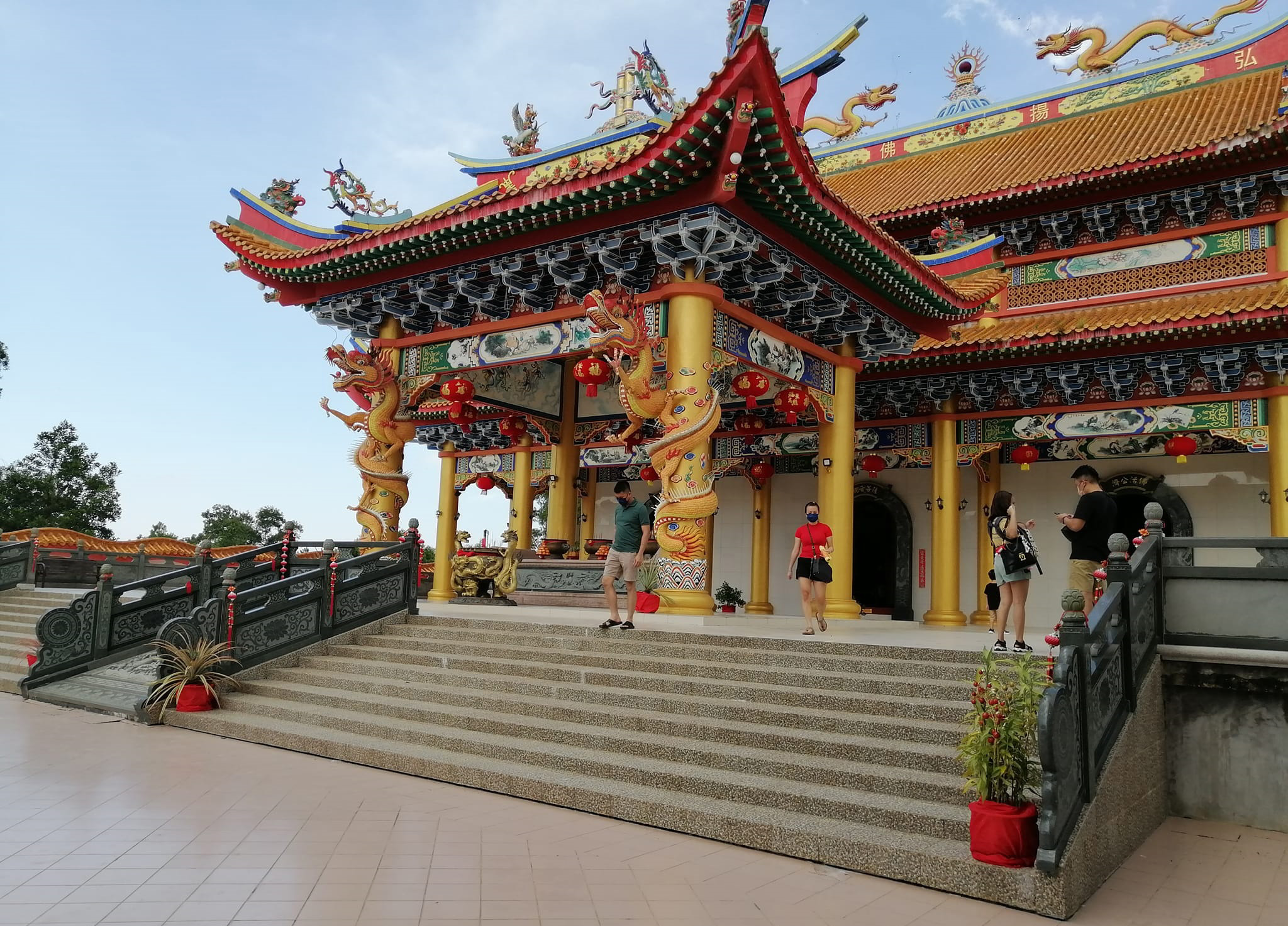 前方的香爐風雨亭與後方主體廟堂構成了整座廟宇的核心景觀。飛簷疊脊、彩繪雕龍、金柱紅牆,皆蘊含著深厚的中華文化底蘊,也象徵了對觀音菩薩的敬奉與對平安幸福的祈願。坐落在馬來西亞砂勞越美里市杜當區的這座寺廟,憑藉傳統建築之美與熱帶環境的自然氛圍,成為當地一處既莊嚴肅穆、又色彩繽紛亮麗的宗教與文化地標。