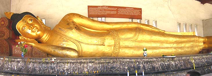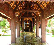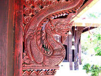 This impressive brick chedi was the oldest building in Wat Chedi Luang. Constructed in a combination of brick and laterite and once towering a height 90 meters (295 feet). It collapsed during an earthquake in 1545. The ruined we see today is an massive base (photo above) The history began in 1401 with the erection of a small chedi in memory of San Muang Ma, who died in that year. This was later enlarged, first by his widow and then again by King Tiloka his grandson Fine elephant heads and carvings of Buddha can still be seen in the niches. The pagoda at Bodh Gaya in India being taken as a model for the chedi. Guarding the entrance to the large wiharn are two magnificent rhinoceros-nosed serpents, their scales made out of brightly glazed tiles. Some small statues and some elaborately carved elephant tusks, the wiharn contains three bronze statues of Buddha cast in 1440. |
