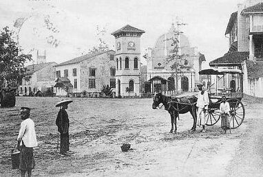 Malacca Town Center around 1900s. The gharry or horse drawn carriage was a popular means of transportation then.