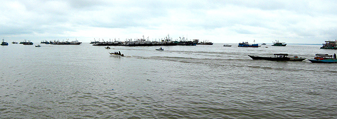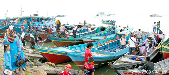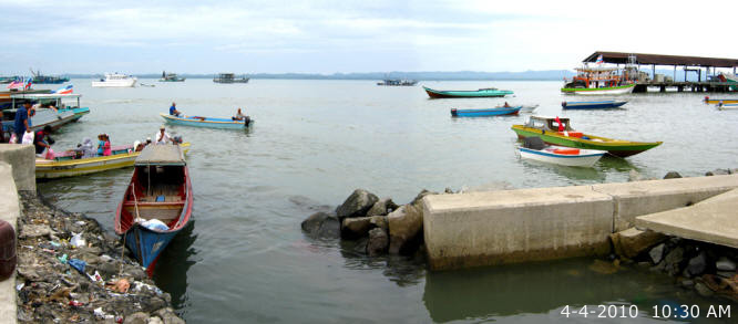 | Photo above: On the left hand side is the Batu jetty used by passenger boats (Jongkong boats) to and from Sebatik Island. On the right hand side is the SAFMA jetty used by fishing boats to upload their daily catch. SAFMA - Sabah Fisheries Marketing Sdn. Bhd. is formally the Sabah Fisheries Marketing Authority. |