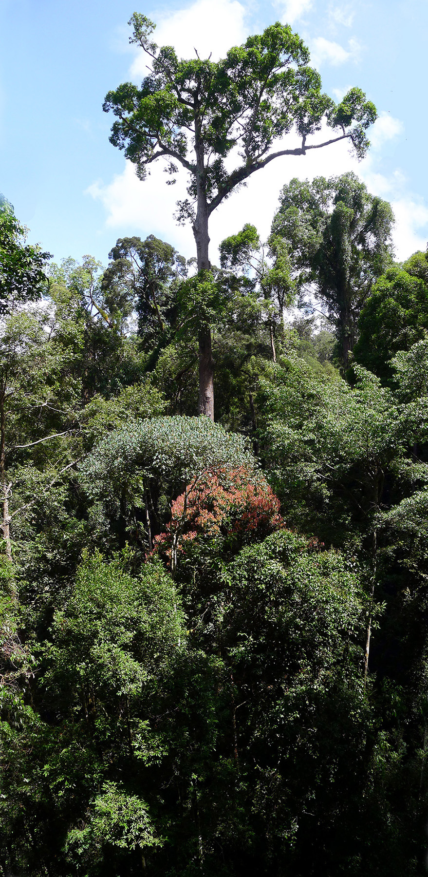 Canopy Walkway of Tawau Hills Park is essentially rope and steel cable suspension bridges that zigzag through the crowns of the tallest strongest and long lasting trees such as "Menggaris" (Kompassia excelsa) and 'Seraya' (Shorea sp). The walkway is composed of a series of 5 meter aluminum ladders bolted together and suspended horizontally from cables. Laced with polyester ropes, the open rungs of ladders are covered with walking the boards. Netting enclosed both sides to add safety.