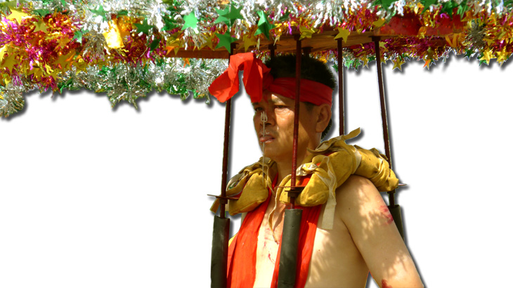 involve piercing the cheeks, chest, back, or tongue with skewers