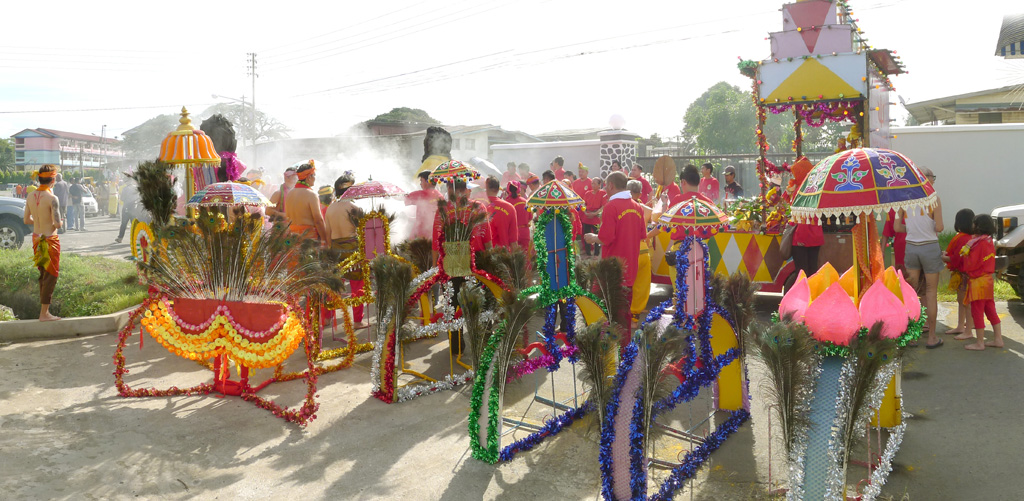 In Tawau Kavadi bearers dressed in yellow, red, and orange