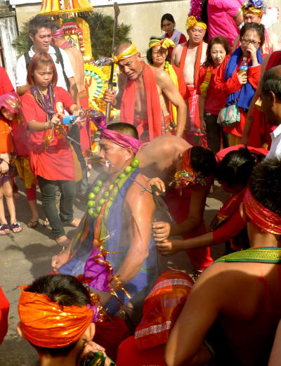 In offering their kavadi to Murugan, devotees inflicting pain on