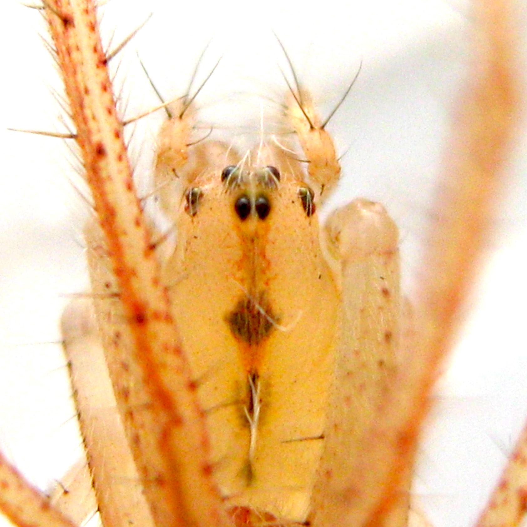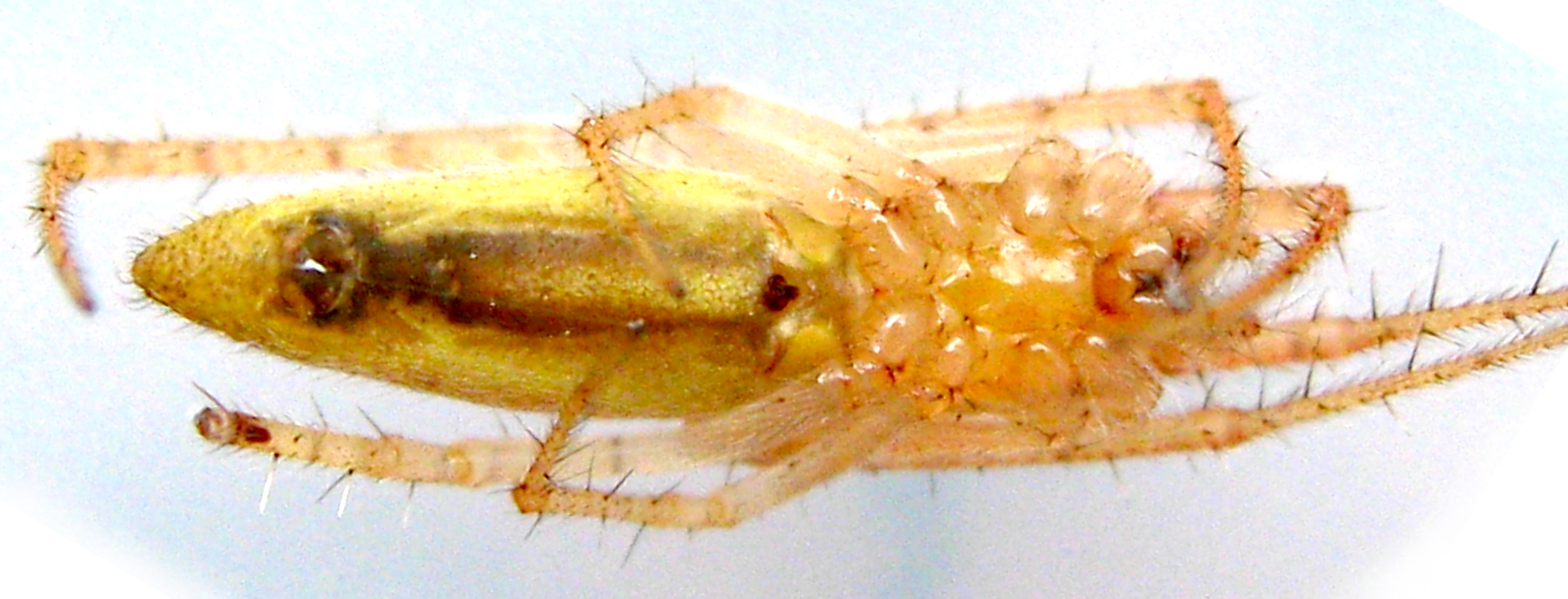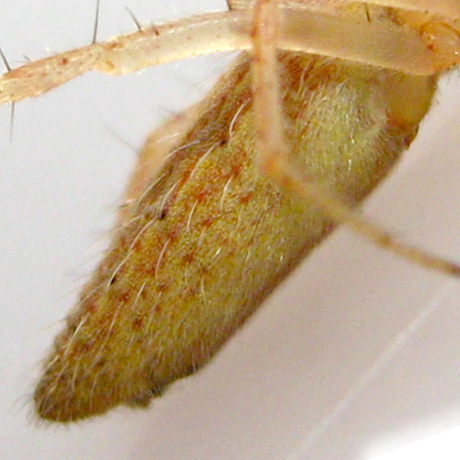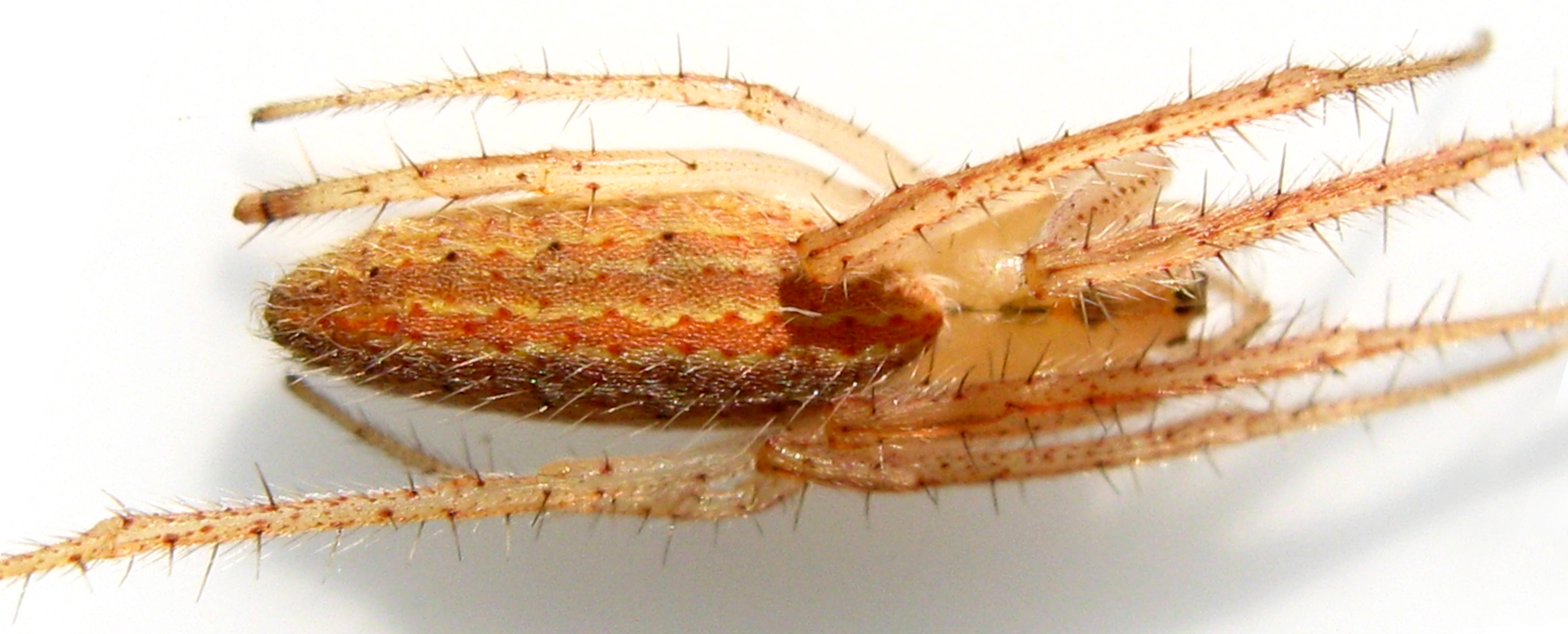 This female body length 9mm, A normal male is 6-8mm, Body color brown, oval-shaped abdomen slender, Abdomen top has yellow belts (brown longitudinal stripes) Long hairy legs with dots. Species mainly distributed in low-elevation mountain areas, low bushes or open habitats in the river. Active at night. Weaving round net. Hid behind leaves during the day. |