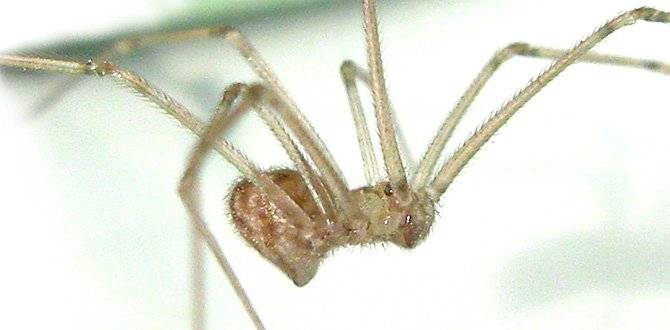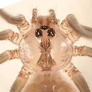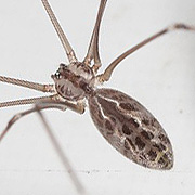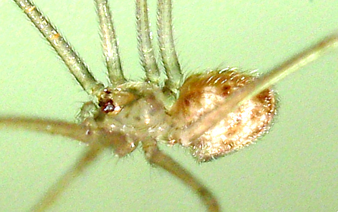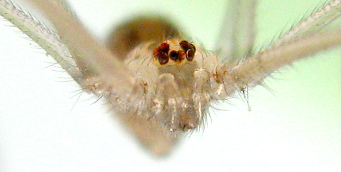 The eight-eye grouped into three groups, the rear and the central eye has three dark longitudinal stripes, abdominal egg type, Dark brown spots, the foot joints are spotted. Distribution of this species in low-lying plains to the mountains, indoor habitat corner, below the washbasin, Kitchenware and other gaps. Web is simple network node, web non-adhesive. When disturbed the body will swing. |