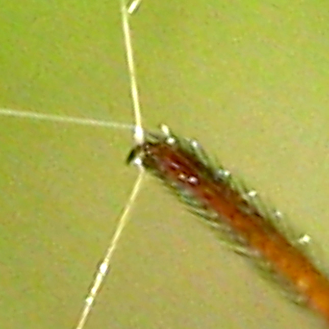 Front of the abdomen of the female tapers strongly and overhangs most of the carapace. The abdomen is tubular, tapers to the front and protrudes to the rear over the spinnerets. There are silver white patches all over the abdomen. The legs are long and thin with dark brown annulations.