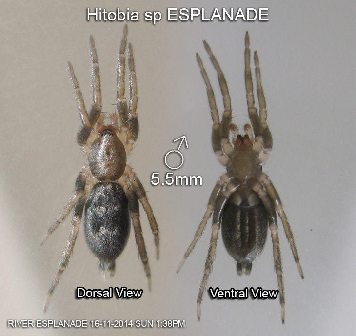 此隸屬於 Hitobia 屬的雄蛛,採集自沙巴 Bandar Sri Indah 的河濱步道,展現了典型的平腹蛛科形態特徵,但也與已描述之 Hitobia 物種存在差異,包括: