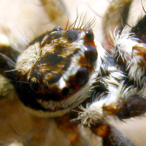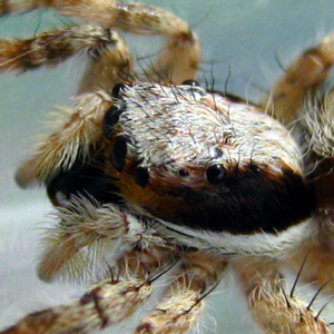 The eight eyes of a female Menemerus bivittatus. Jumping spiders can see in color (DeVoe 1975), and the large front eyes focus on objects (Land 1972). |