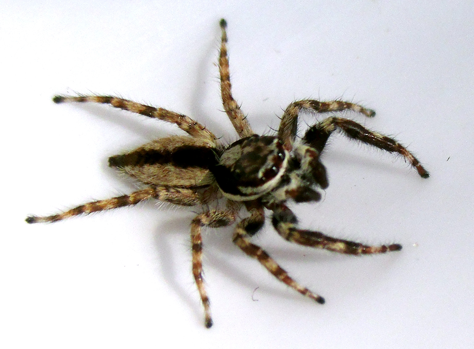 The carapace is mostly black with a white stripe on each side and one down the middle, the lateral stripes joining in front across the clypeus. Male has a distinctive white inverted "V" mark occurs on the chellicerae. The female is gray dorsally, the carapace edged with a thin white stripe laterally and an orange clypeus; the semifoliar gray abdomen is edged with broad black stripes on each side which meet posteriorly. Immatures closely resemble the adult females, although sub-adult males may be distinguished by their swollen palpi. All free-living stages feed primarily on small Diptera which alight on buildings, although they are capable of capturing large crane flies twice their length, and larger, heavier muscoid flies. Females make a white eggsac in a crevice, somewhat flattened and about 1.5 cm in diameter, inside which they stay and guard 25 to 40 eggs which are contained inside a lenticular silken case about 6 mm in diameter. Spiderlings disperse about three weeks after the eggs are laid. |