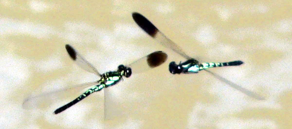 There is a good deal of variation in the extent of the green marking and of the dark patch, but present opinion holds that there is just one species. Males spend many hours in contests facing each other, hovering around almost the same spot. A climactic event in aggressive behavior is the 'stationary-wing display', during which the dominant male flies with his hind wings while holding the dark-tipped forewings outstretched and motionless, facing the opponent. An opponent confronted with this display shows considerable agitation, rocking rapidly from side to side, and often abandons the contest. Courtship too, is often protracted with the male swinging to and fro as close as 10 cm in front of the female. Curiously, the males lack the white coloration on the legs found on other species. During courtship the legs dangle limply below the body rather than being thrust toward the female in display. Almost all females which land in a male's territory and attempt to oviposit are courted vigorously. Following a successful courtship, mating takes place on the log just above the water. The pair remain together for about a minute . Females are guarded while they remain in a male's territory but they often oviposit in groups in company with Rhinocypha species. Females in groups almost never respond to courtship; at this stage they are probably not receptive and courting males become disorientated with respect to which female they have selected. Males also rest on logs near the water while waiting for females, and both sexes often fall prey to Dolomedes spiders . Individuals which escape such depredations may live for about 10-14 days after they commence reproduction, spending their entire life stationed around the same log. Libellago semiopaca is locally common on clear forest streams and near the banks of broad rivers throughout Sundaland. |