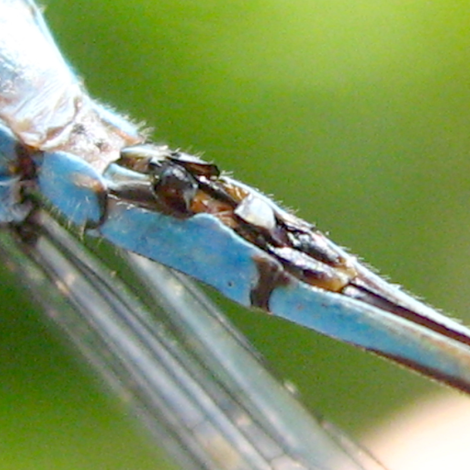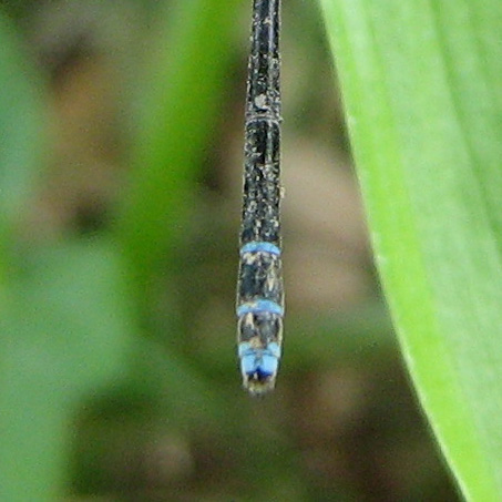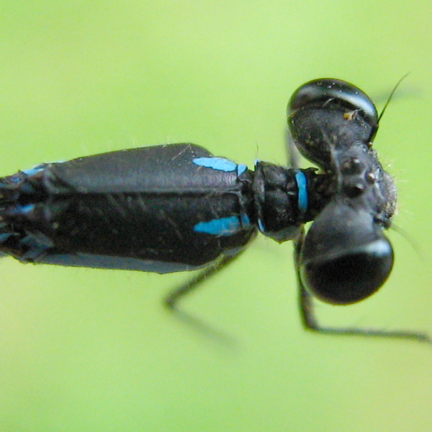 | The male has a deeper blue thorax as compared to the female. | The female has some yellow on the lower part of the body while the male is in complete blue. |