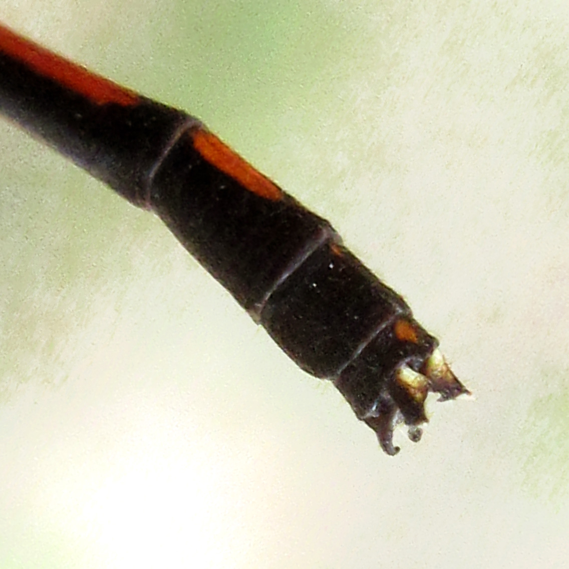 Tip of abdomen of a male Prodasineura hyperythra is the four terminal appendages