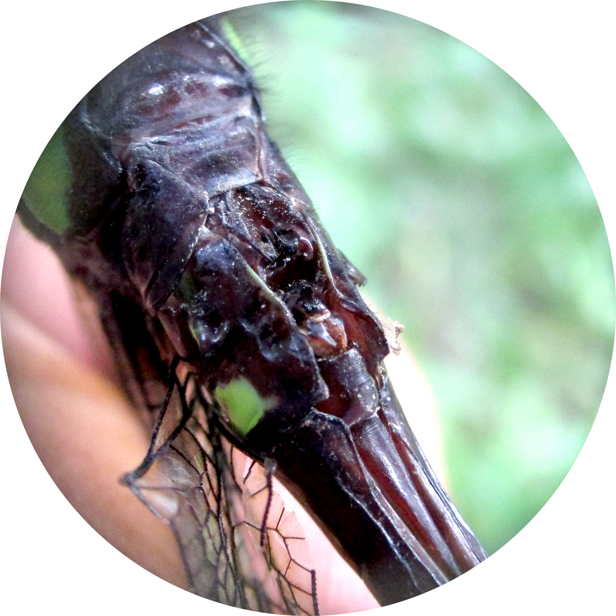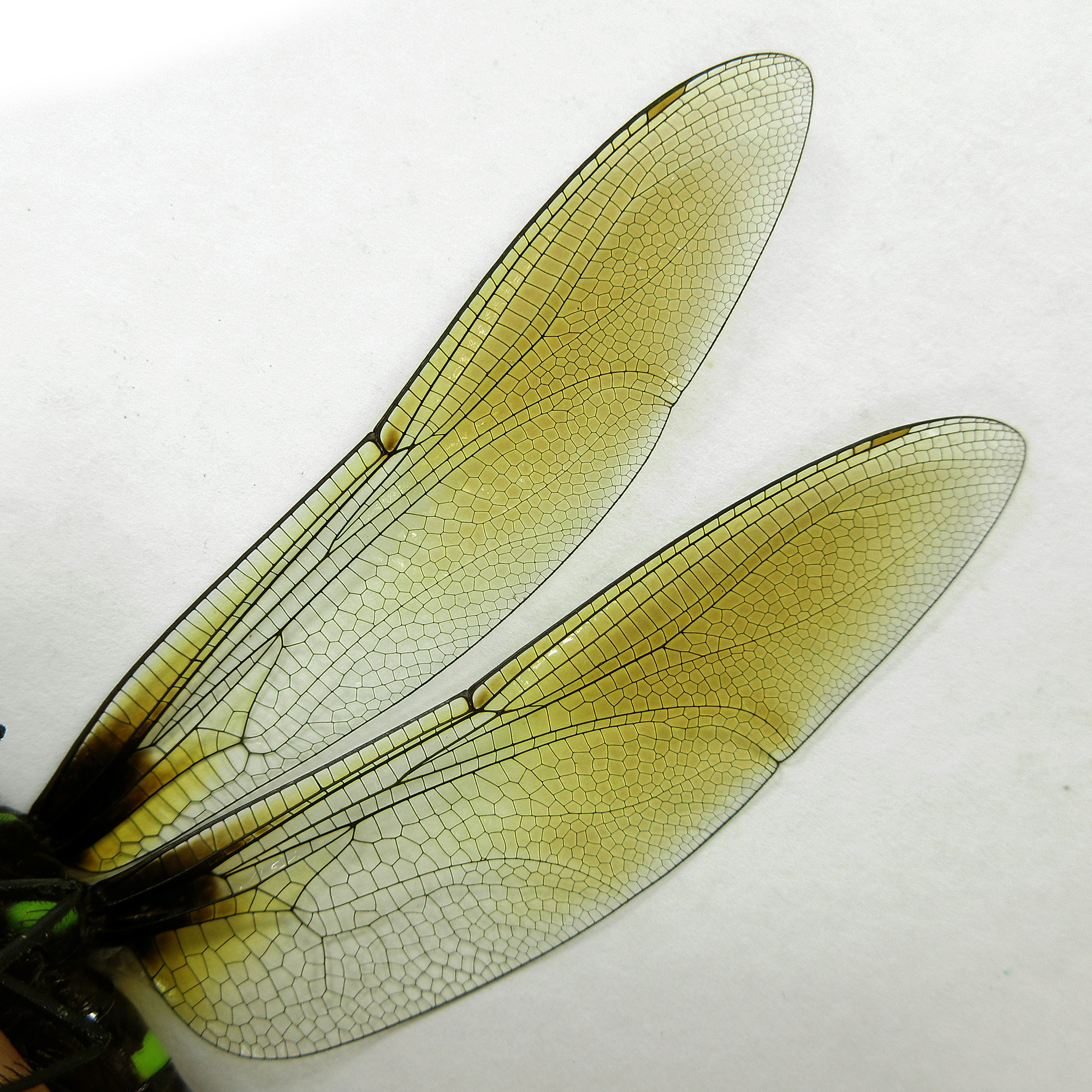 A spectacular and common dragonflies to be found inside the rainforest of Malaysia is Indaeschna grubaueri . It is another very large species (Male hw, 63-65 mm) quite the equal of any Tetracanthagyna except plagiata. In both the male and female the head and thorax are brightly marked with green and the abdomen has broad lime green bands at the distal end of segments 2-6 or 7.