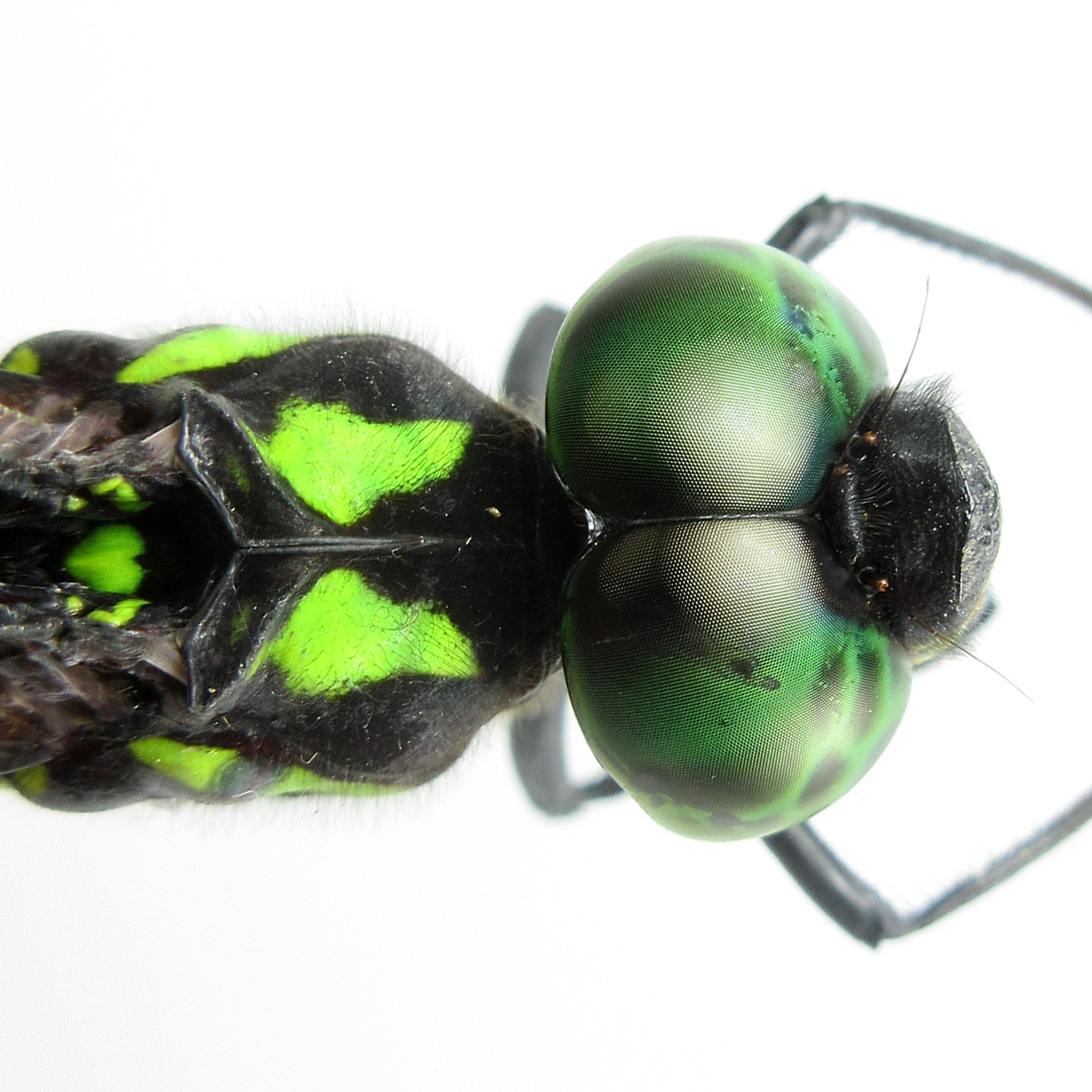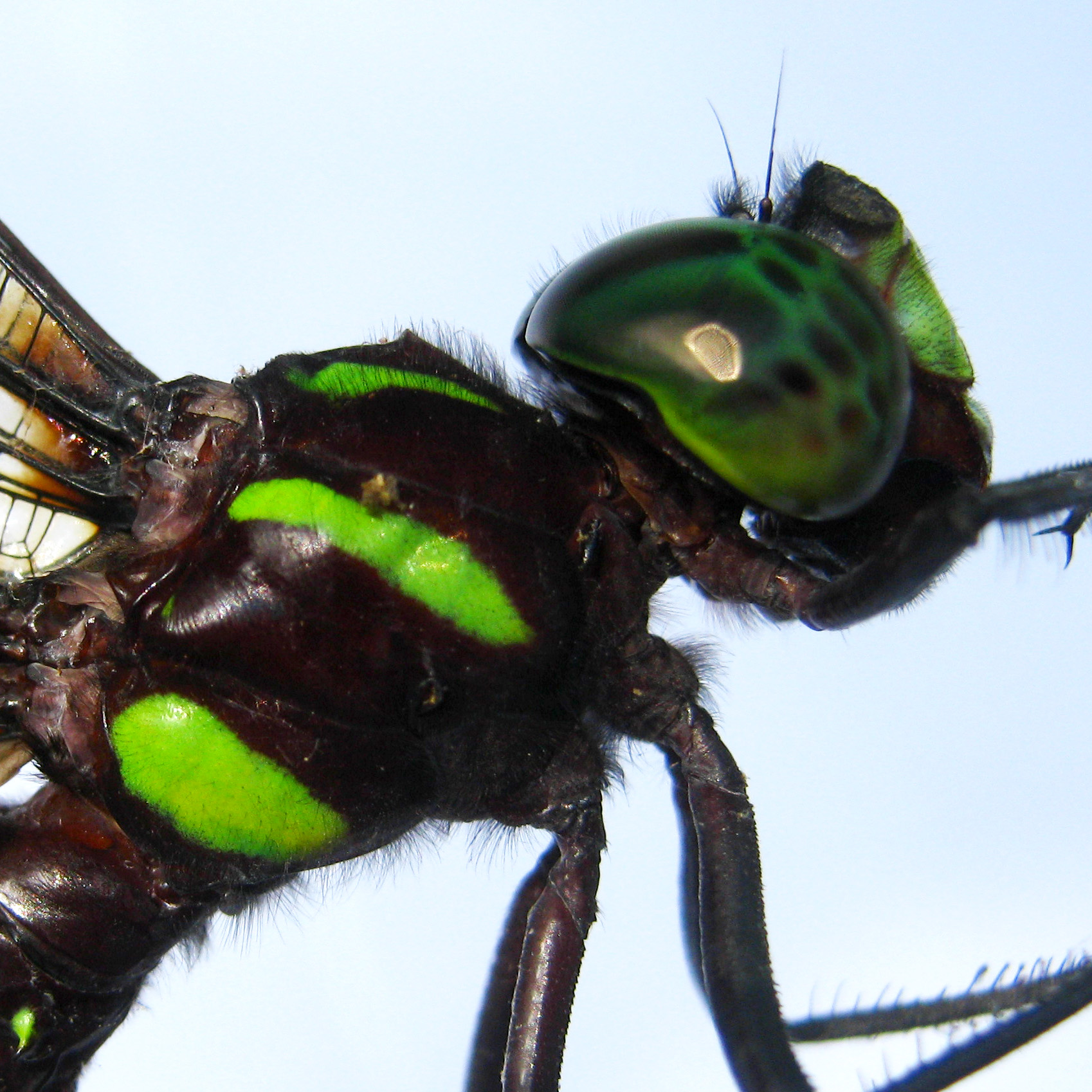 Dragonflies and damselflies have large compound eyes that can see in all directions. When the compound eye is magnified several hundred times, each individual facet (ommatidium) is shown to be hexagonal in shape.