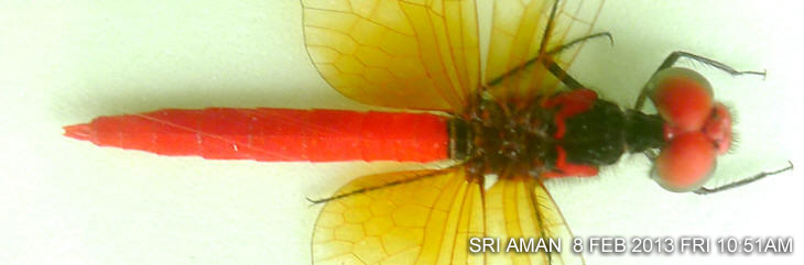 Family: Libellulidae Date 8 February 2013 Friday 10:00AM Location : Sri Aman, Lupar River A male Nannophya pygmaea found in Sri Aman beside a road dranage in March 2013. Together with this one are few other male in the same corner of drain. All perching on tall grasses above water. No female were seen that morning. Nannophya pygmaea easily the smallest anisopteran in the region and one of the smallest in the world. Nannophya pygmaea, also known as the Scarlet Dwarf, Northern Pygmyfly, or Tiny Dragonfly Belong to the family Libellulidae, native from Southeast Asia to China and Japan, occasionally found south to Australia.