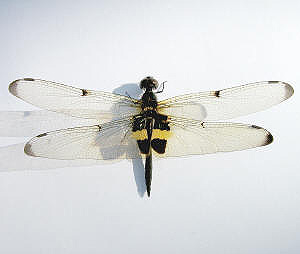 The genus Rhyothemis includes five species with short abdomens and broad hind wings. Both wings frequently have extensive areas of solid color. They perch in sunlight and are found most commonly in open country. Some species are notable for the way they twist their wings obliquely relative to the sun. This behavior is believed to aid in thermoregulation. They also often rest with the fore and hind wings held at widely different angles, typically with the forewings raised and the hind wings depressed.