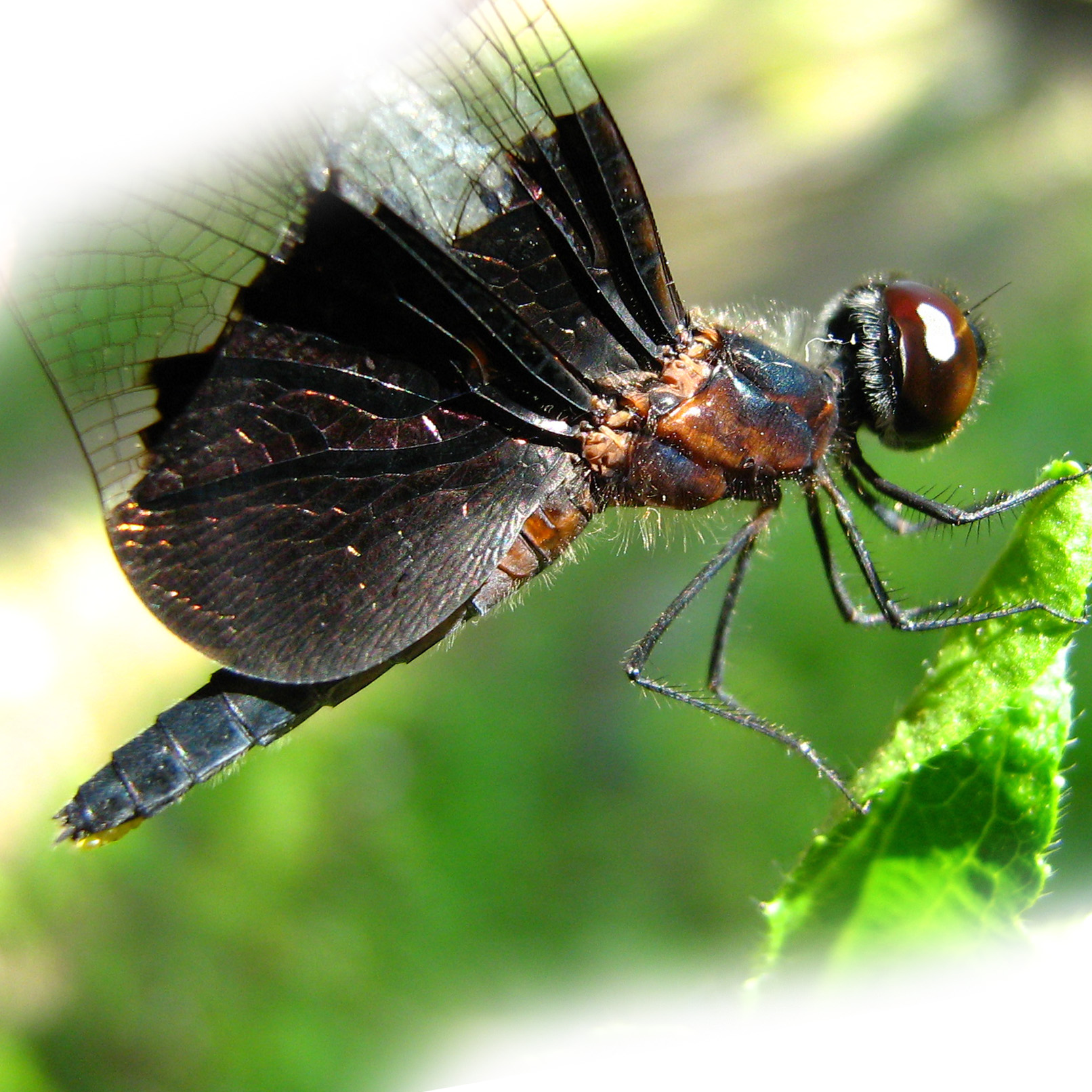 Rhyothemis aterrima is a larger species ( hw, 29-30 mm) with wings entirely metallic blue-black in color shot with a bluish- or greenish-gold iridescence which sparkles in sunlight. It is found locally on lakes and in blackwater marshes in lowland areas and where present may be abundant. Males are very aggressive and frequently engage in high speed pursuits, buffeting one another with an audible clash of wings. Many specimens show much wear and tear from these hostilities.