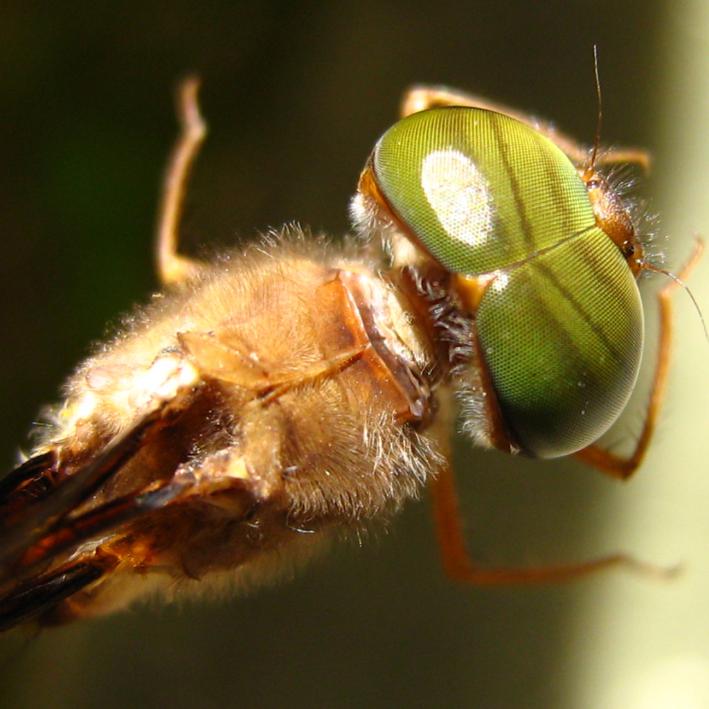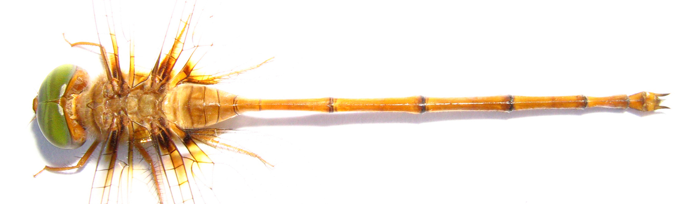 and green eyes with very slender abdomen swollen at base basally then exceedingly thin.