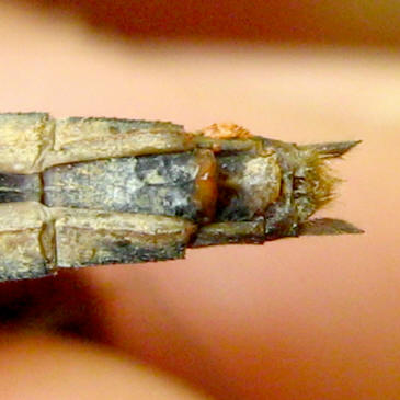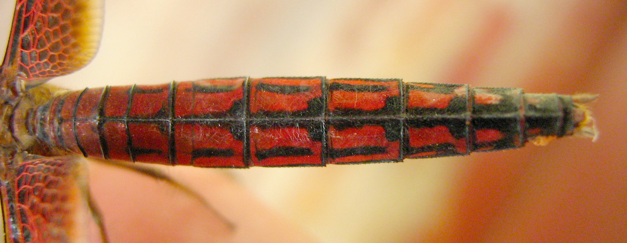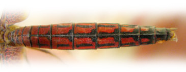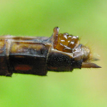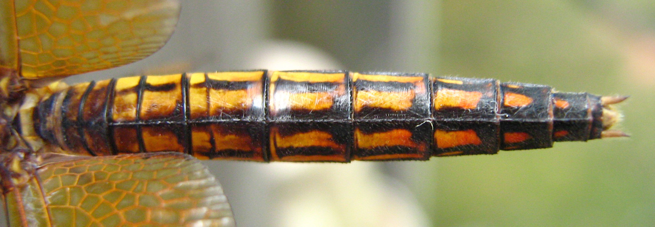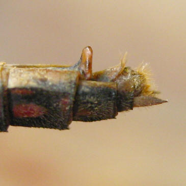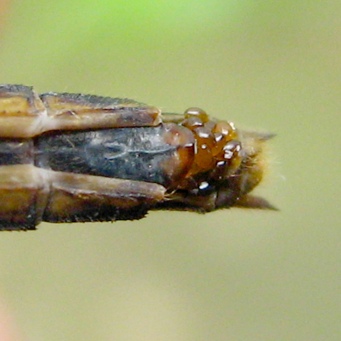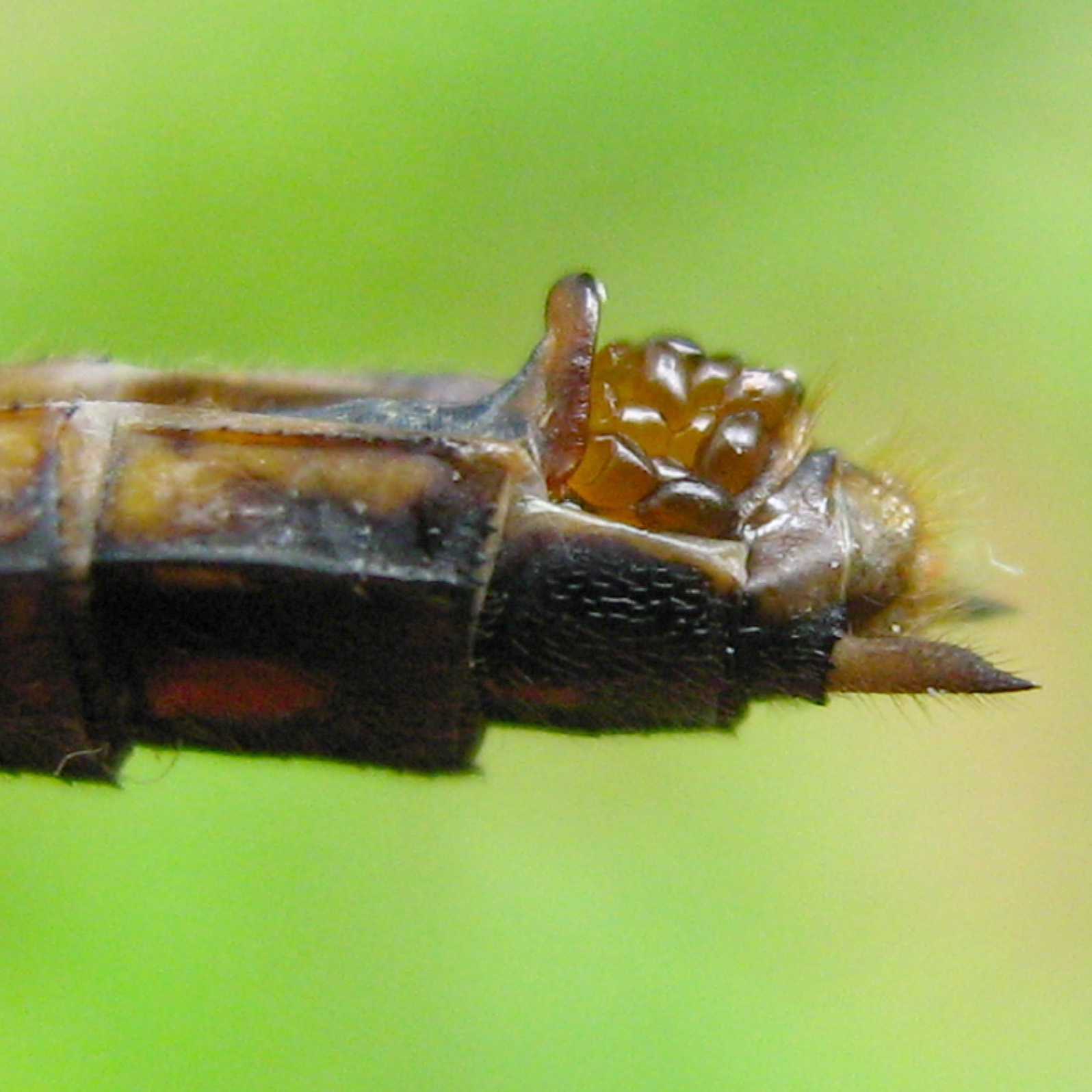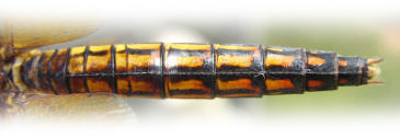 Mud stain on the ovipositor indicating this female has laid eggs on muddy water surface. This this is a mature female. |