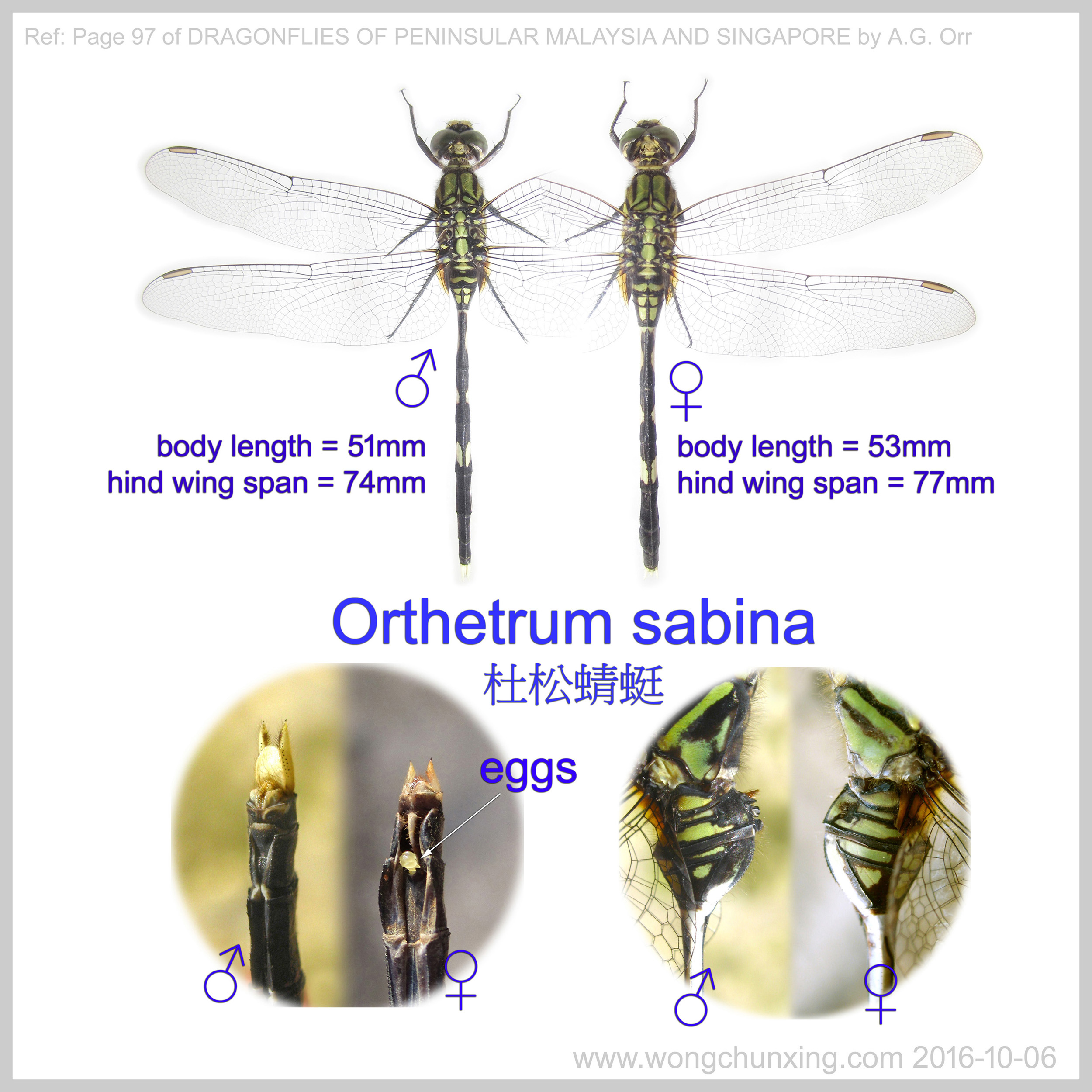狭腹灰蜻 (杜松蜻蜓) Orthetrum sabina (Drury,1770) 雄蟲複眼律色或深綠色,胸部綠色或黃綠色,側視具6條散亂的黑色斑紋, 雌蟲外觀近似雄蟲,可從尾毛的構造分別。 复眼为墨绿色, 生活於低中海拔山區,常見於水田、池塘、沼澤等水域活動,環境適應能力佳,為優勢的種類,數量很多。