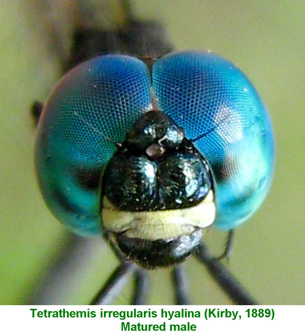 Tetrathemis irregularis eyes are a strikingly brilliant blue/green.