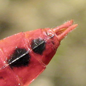 reddish-brown patch at the base of the wings instead of a hyaline yellow area.