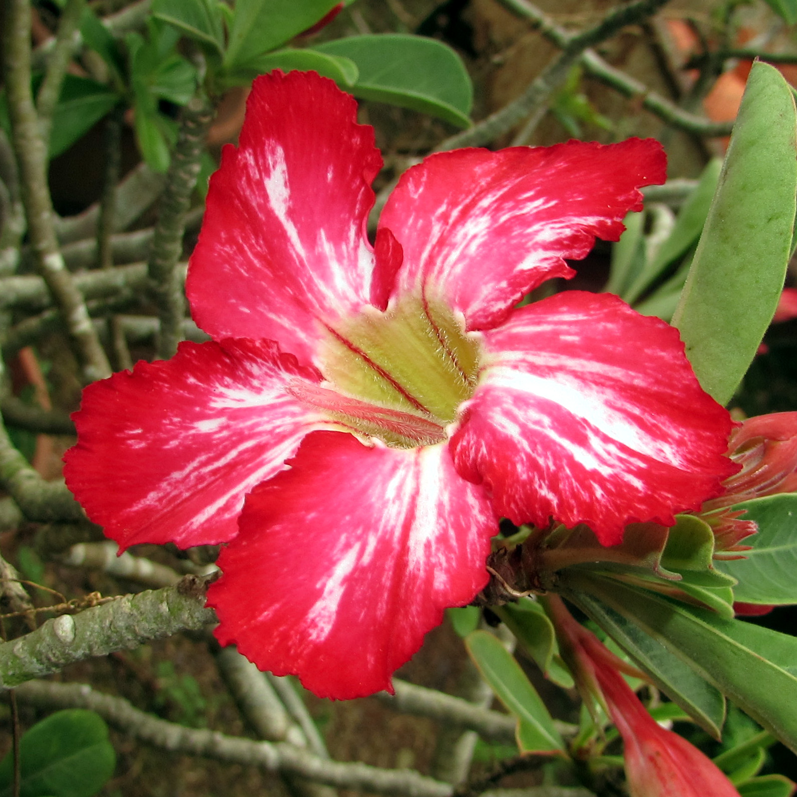 Grafted (接枝) two color Adenium obesun flowers on one plant.