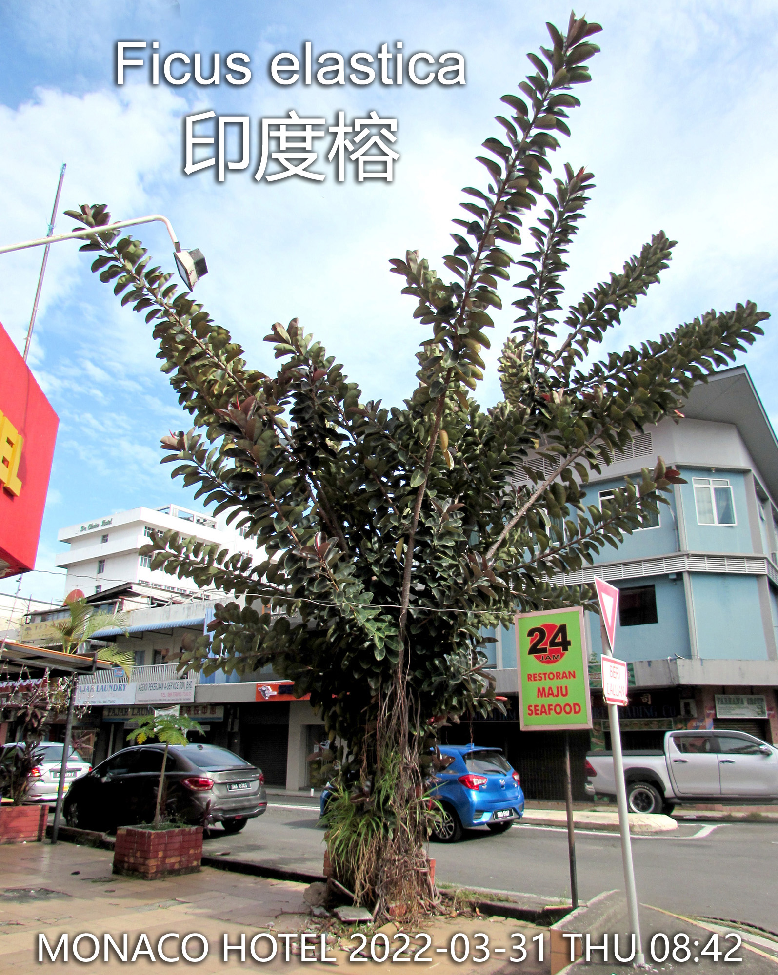 This Ficus elastica is planted in front Monaco Hotel and beside the busy road.