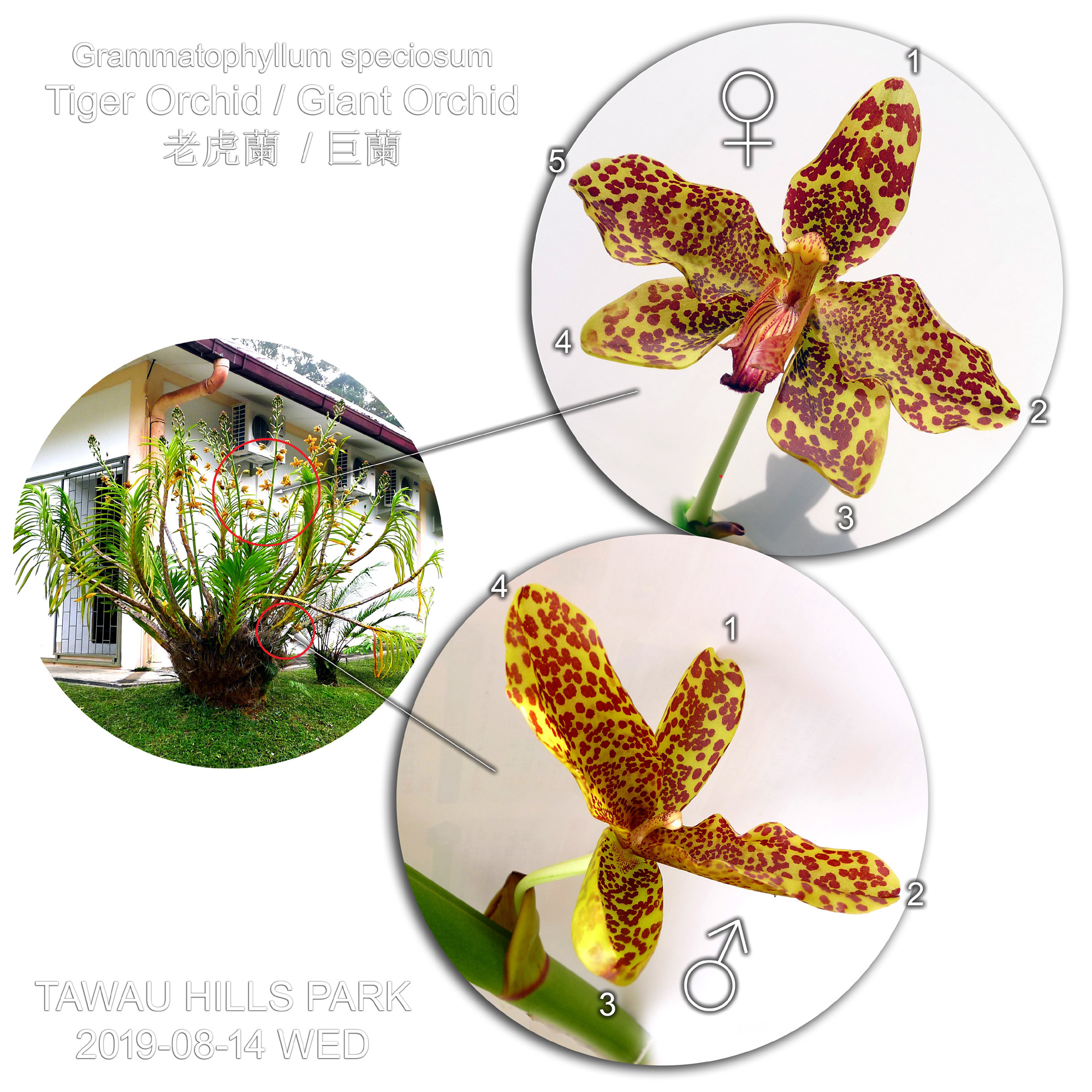 Grammatophyllum speciosum flowers are remarkable, since the lowest flowers have no lip and these flowers function as osmophores (male flower) for the entire inflorescence and continue to emit chemical scent to attract pollinators as flowers open in succession.