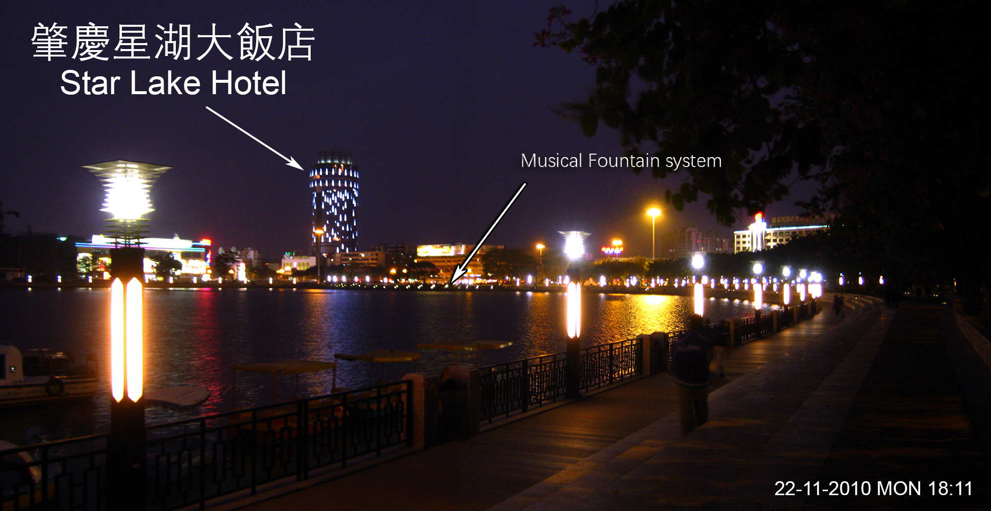 Night scene of Star Lake in Zhaoqing with Star Lake Hotel in background. Sport
