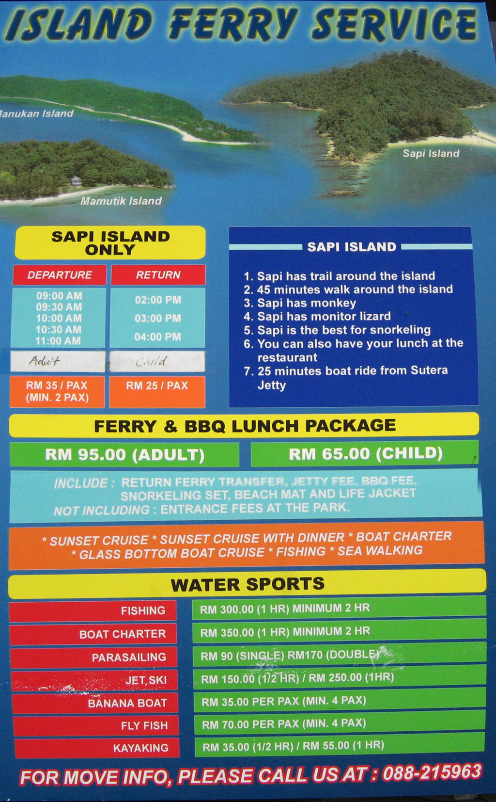 飯店外面的港灣,在港灣邊 SeaQuest 的水上運動項目服務中心。 在那裡提供了一天中非常方便的往返酒店和各個島嶼以及各個島嶼之間的遊船時刻表。 我們可以根據自己的時間安排做幾點的船到哪幾個地方以及最後返回的時間。