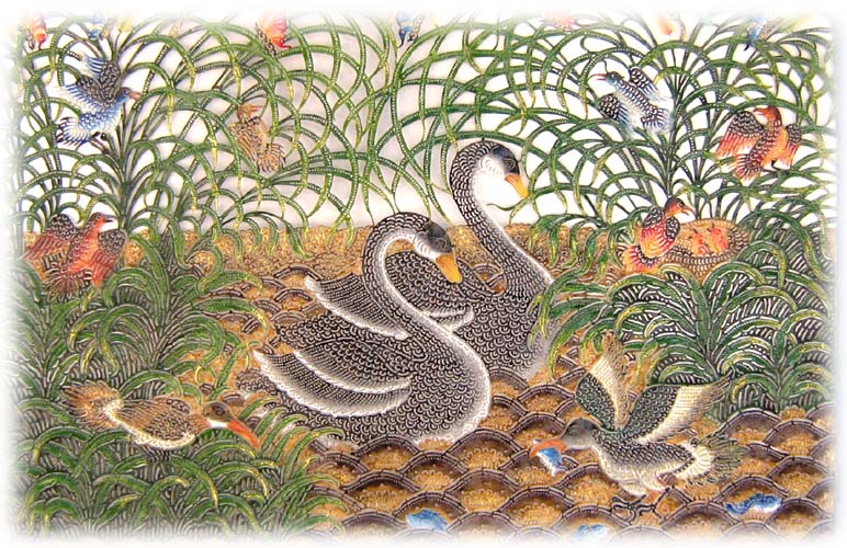 a scene from a theatrical play or folk tale. Black paint and paints of various