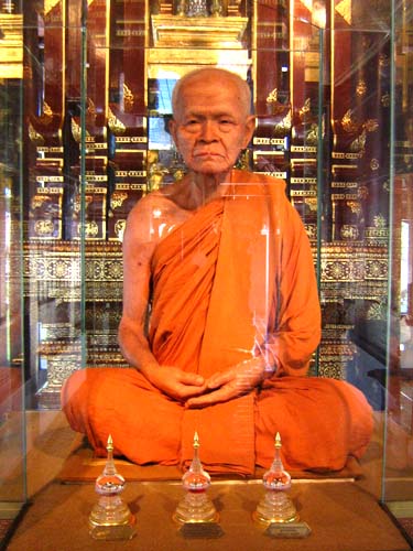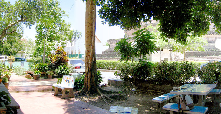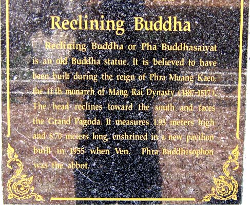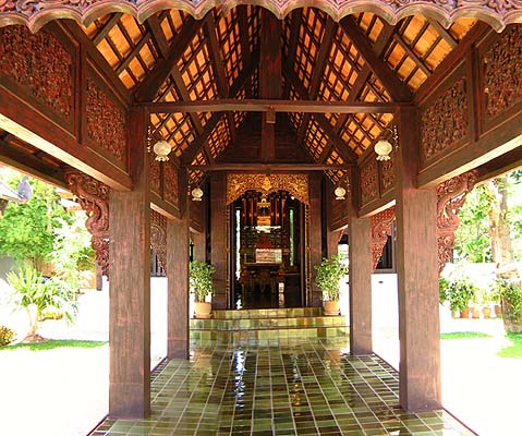 This impressive brick chedi was the oldest building in Wat Chedi Luang. Constructed in a combination of brick and laterite and once towering a height 90 meters (295 feet). It collapsed during an earthquake in 1545. The ruined we see today is an massive base (photo above) The history began in 1401 with the erection of a small chedi in memory of San Muang Ma, who died in that year. This was later enlarged, first by his widow and then again by King Tiloka his grandson Fine elephant heads and carvings of Buddha can still be seen in the niches. The pagoda at Bodh Gaya in India being taken as a model for the chedi. Guarding the entrance to the large wiharn are two magnificent rhinoceros-nosed serpents, their scales made out of brightly glazed tiles. Some small statues and some elaborately carved elephant tusks, the wiharn contains three bronze statues of Buddha cast in 1440. |