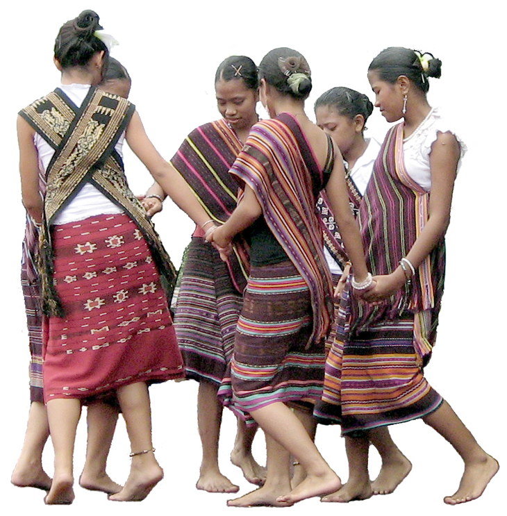 Photo Above : Likurai Dance in traditional scarves - tais. In the old days the dance was performed by women to welcome home men after war. Today's modern version of Likurai Dance is used by young women in courtship. Music and Dances of the Timorese