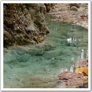 Crystal Clear Minerals Water Under this mass body of solidified rock are couple of spring heads. Spring water from the sulphurous spring is crystal clear and cyan in color due to the minerals. The spring water is cool, not even lukewarm. |