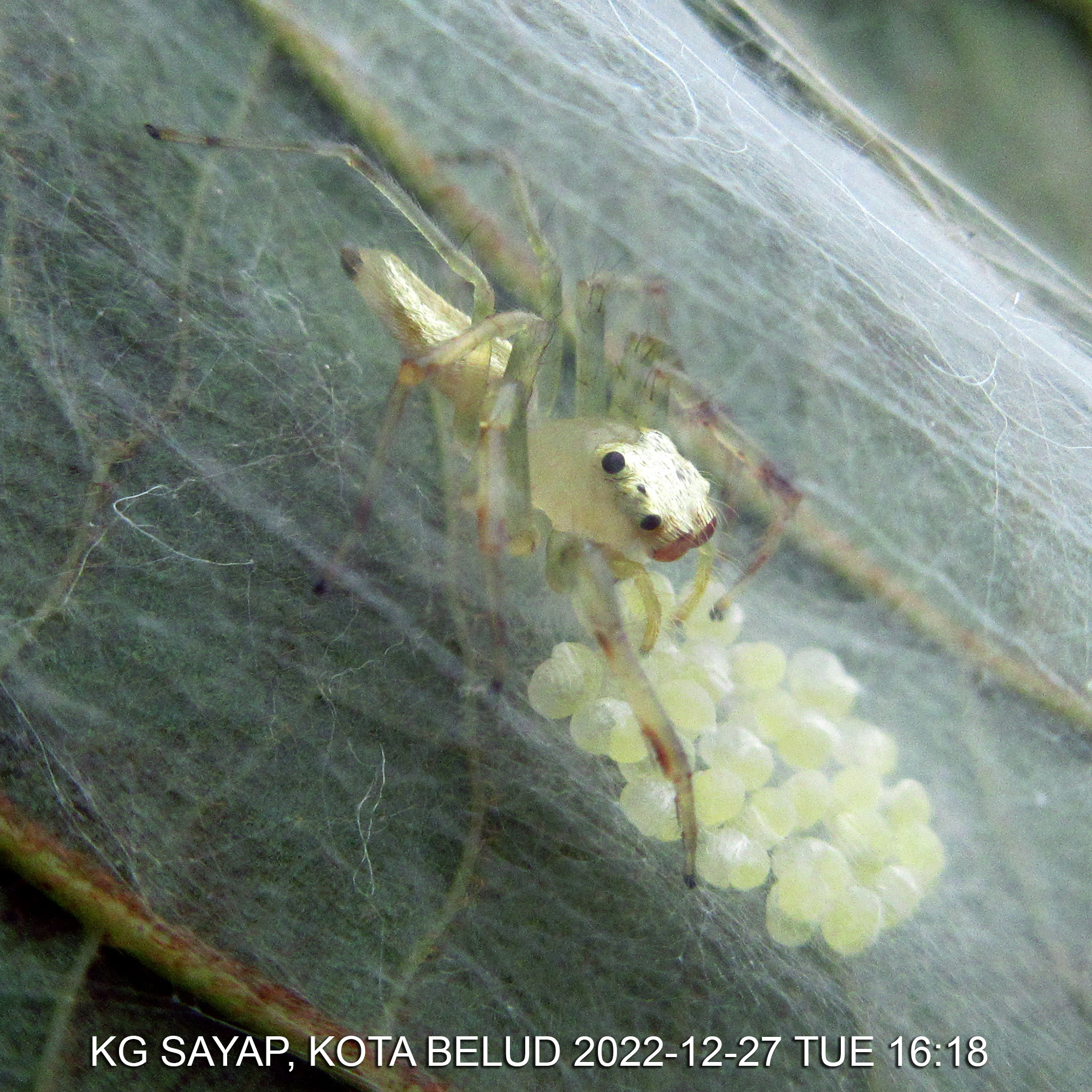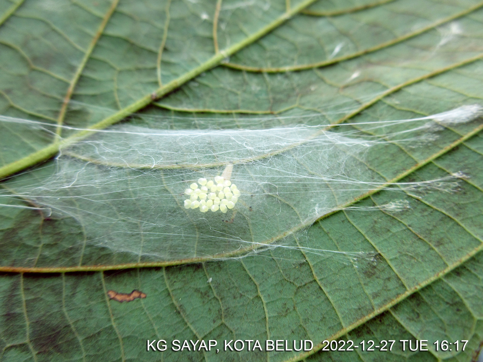 About 30 over eggs in total. The nest was made on the underside of leaf. The web nest has small gaps on both ends for entrance and exit.