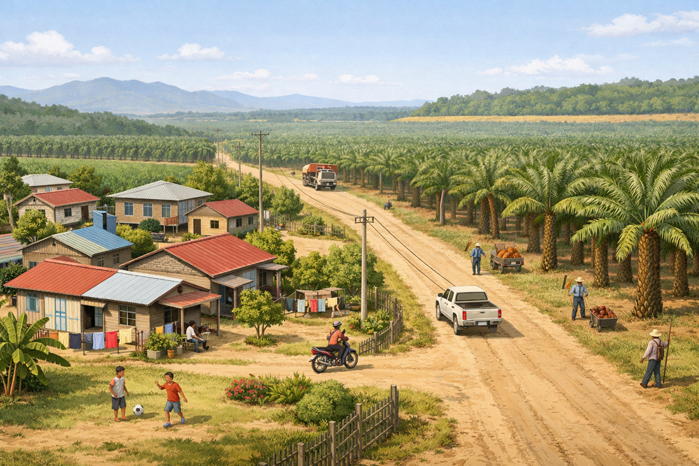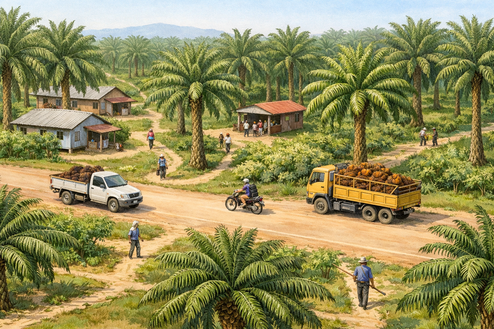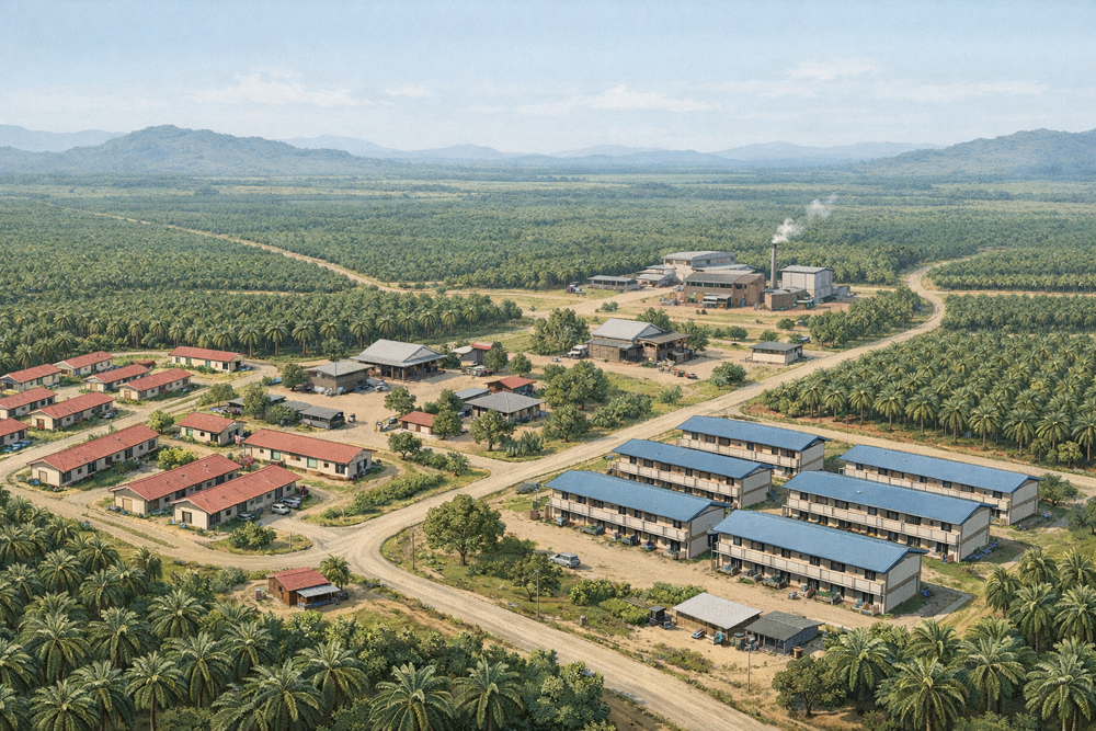 Plantation communities are usually located within or beside large oil palm estates. Housing, roads, and shared facilities are arranged in relation to plantation operations and land use.