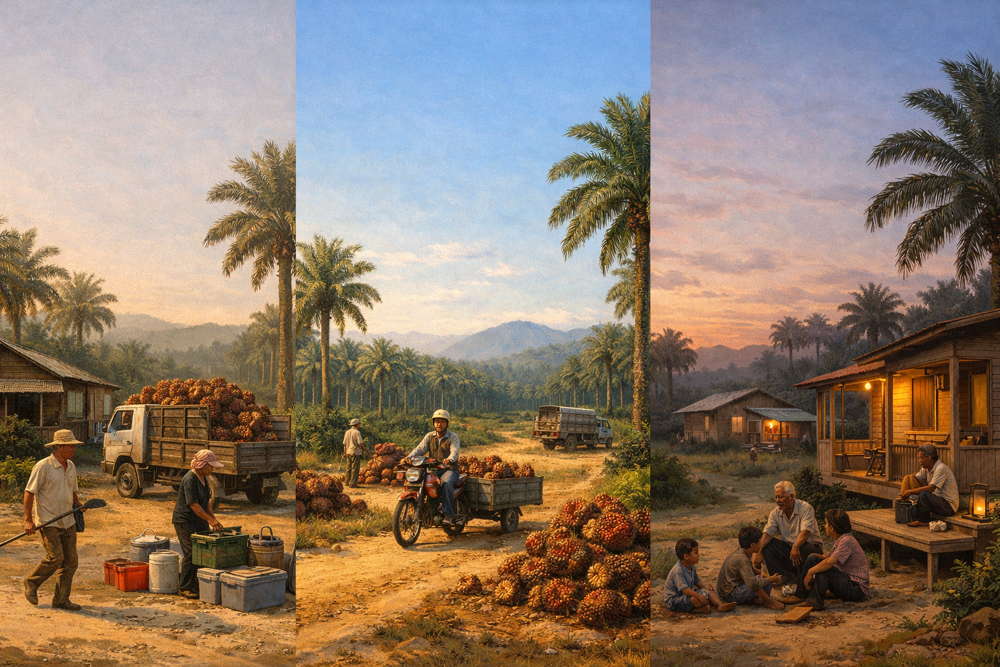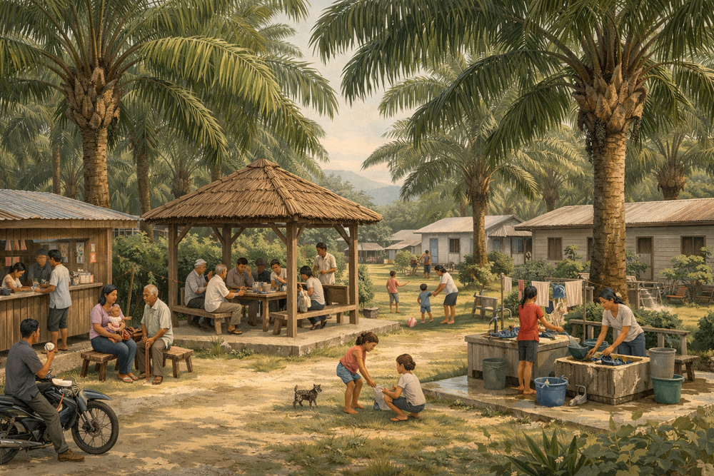In parts of Tawau, some communities are organised around oil palm plantations. This page introduces how daily life is structured in plantation communities, focusing on space, movement, time, and shared facilities.