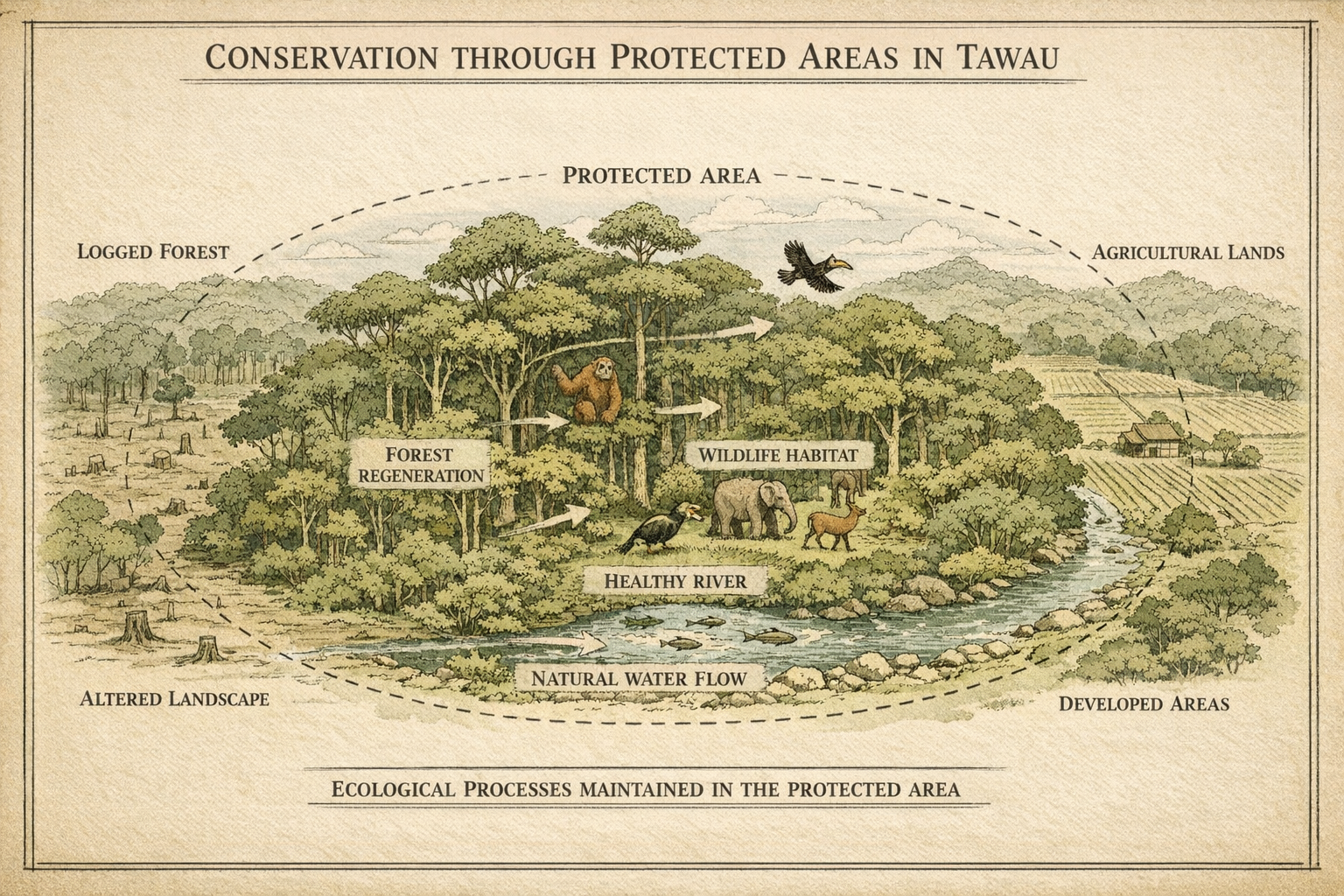 Kawasan terlindung menyatukan dasar konservasi, penyelidikan saintifik, dan pendidikan awam, membolehkan orang ramai mengalami warisan semula jadi Tawau sambil memastikan sistem ekologi kekal tahan lasak.