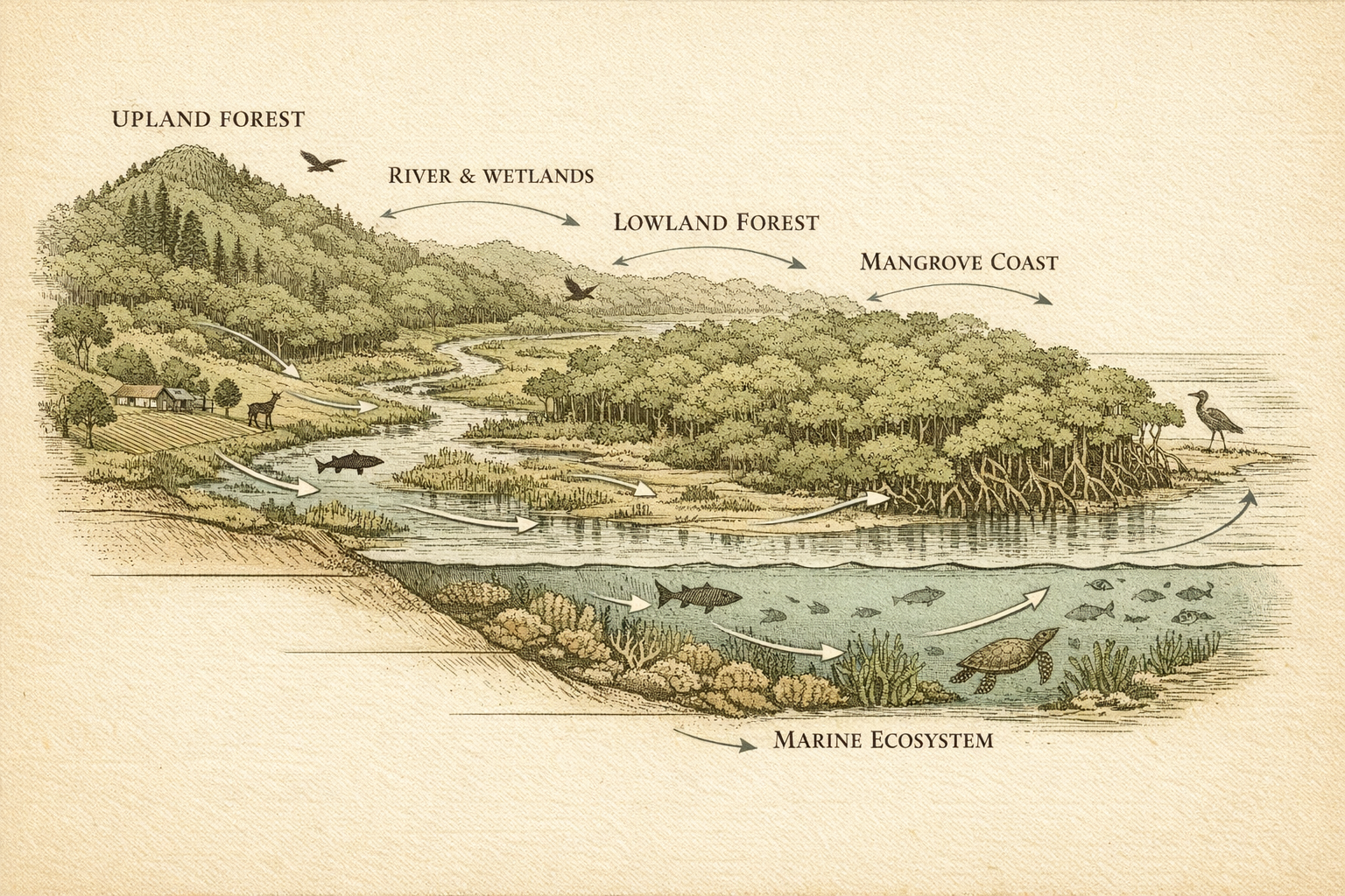 Menghubungkan persekitaran daratan dan marin, mengangkut nutrien penting